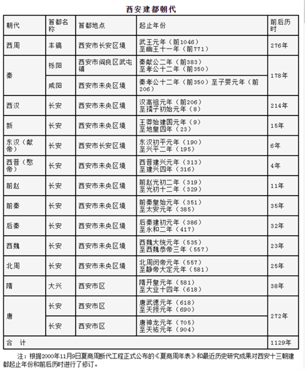西周、秦、西汉、新莽、东汉(献帝初)、西晋(愍帝)、前赵、前秦、后秦、西魏、北周、隋、唐等都在此建都。