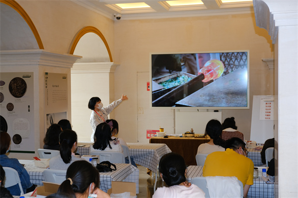 讲解员带领观众参观常设展览“海国微澜——故宫博物院藏外国文物展”,重点欣赏、讲解西洋玻璃器展品。