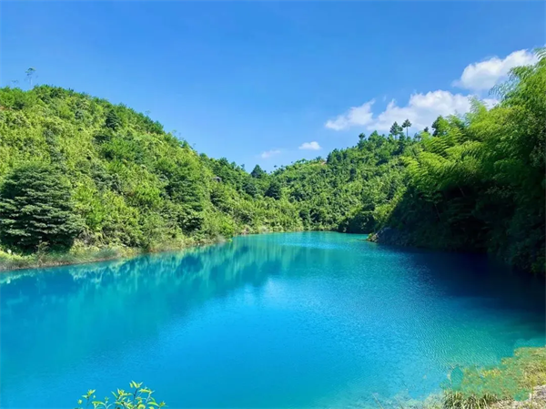 整体呈月牙形状,溪水晶莹剔透,清澈见底。因为各种矿物质沉积,再加上光的折射现象等多种自然条件综合作用,七彩池形成了五光十色的瑰丽景色,因此,也被称为“闽南小九寨”。