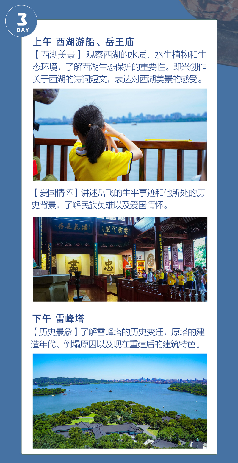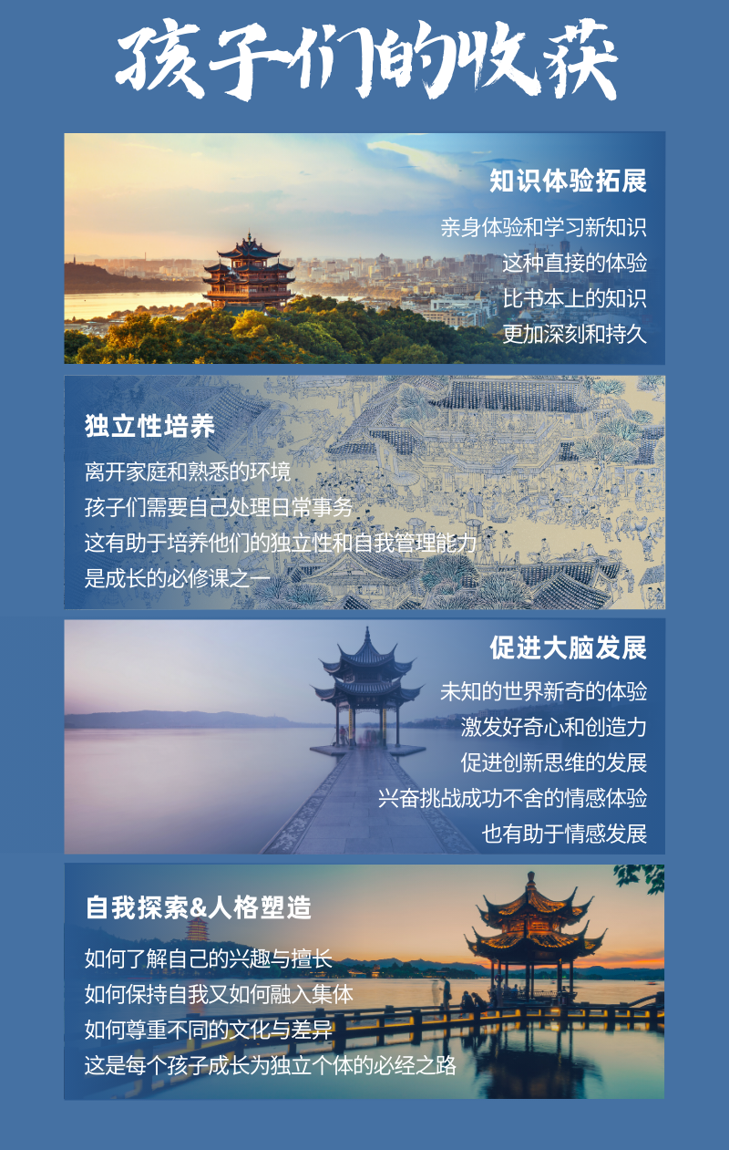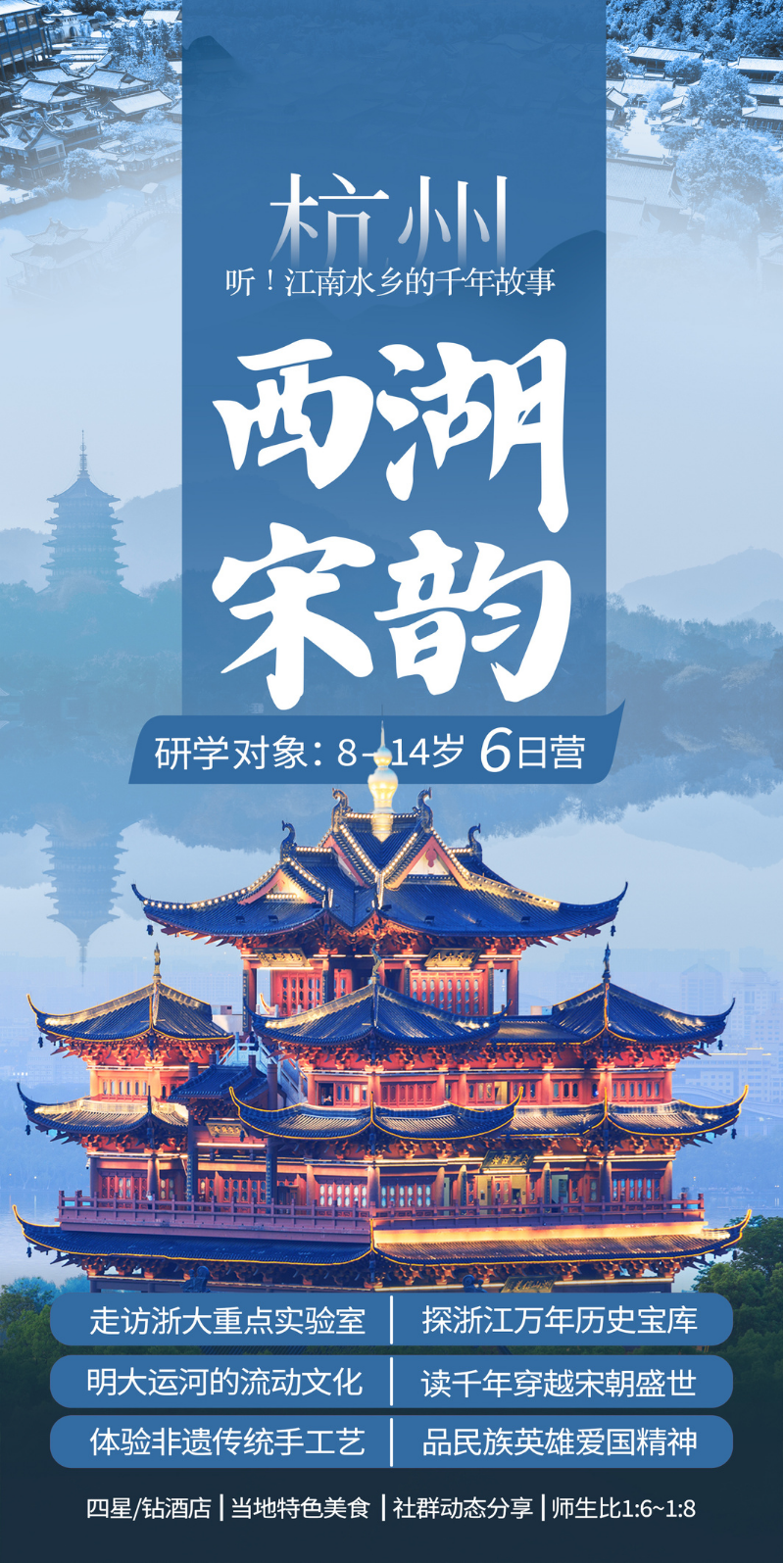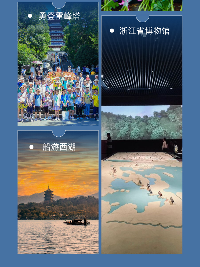 餐饮:开营日晚餐,结营日早餐,及其他研学行程中的三餐,穿插安排杭州等当地特色美食。