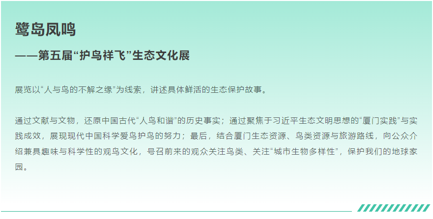 候鸟见证了城市宜居“天堂”的另一面,厦门是“生物多样性魅力城市”和 “自然城市”,这份荣誉来自厦门生态文明实践的集体努力,显见于冬候鸟鸬鹚,夏候鸟栗喉蜂虎对这座城市的驻足“青睐”。我们一起从文物到自然,认识候鸟,一起守护对自然友善的大厦之门。