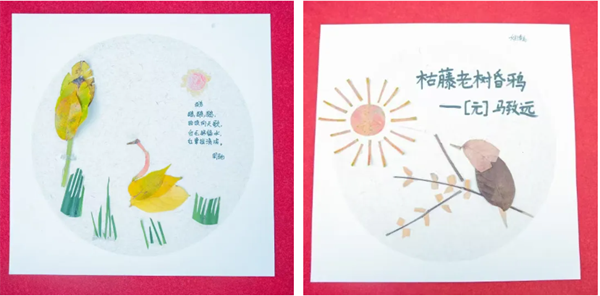 基于本次对艺术品的欣赏和解读,引导孩子们回顾日常学习的知识和诗句,并引导学生利用自然物展开想象,将诗歌所描绘的场景创作拼贴成一幅幅独特的艺术品。