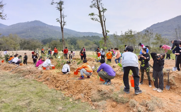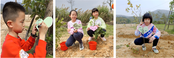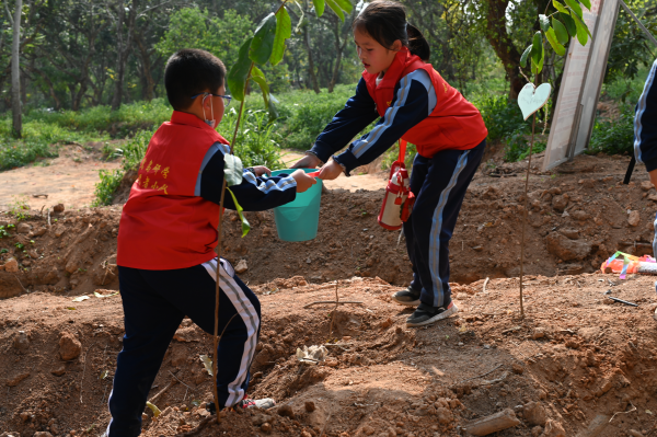 爱绿护绿在行动,和同伴一起挥锹挖土、栽种树苗、浇水呵护,用行动为地球添一抹绿色,树立地球环保小卫士的使命感。