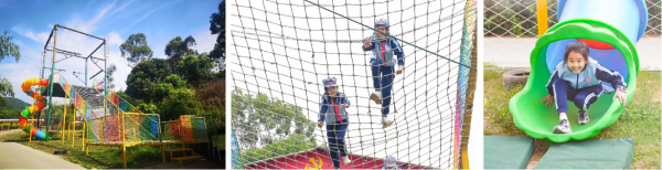 勇攀高峰:爬上攀爬网,向着高处行,挑战胆量和勇气,克服胆怯往上爬,顶峰相见,再来彩虹隧道滑行,感受刺激和欢乐。