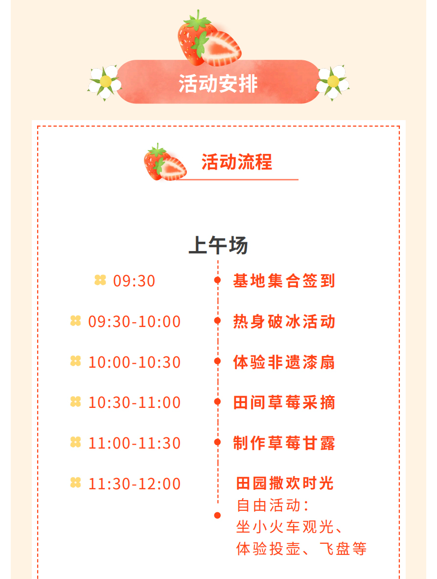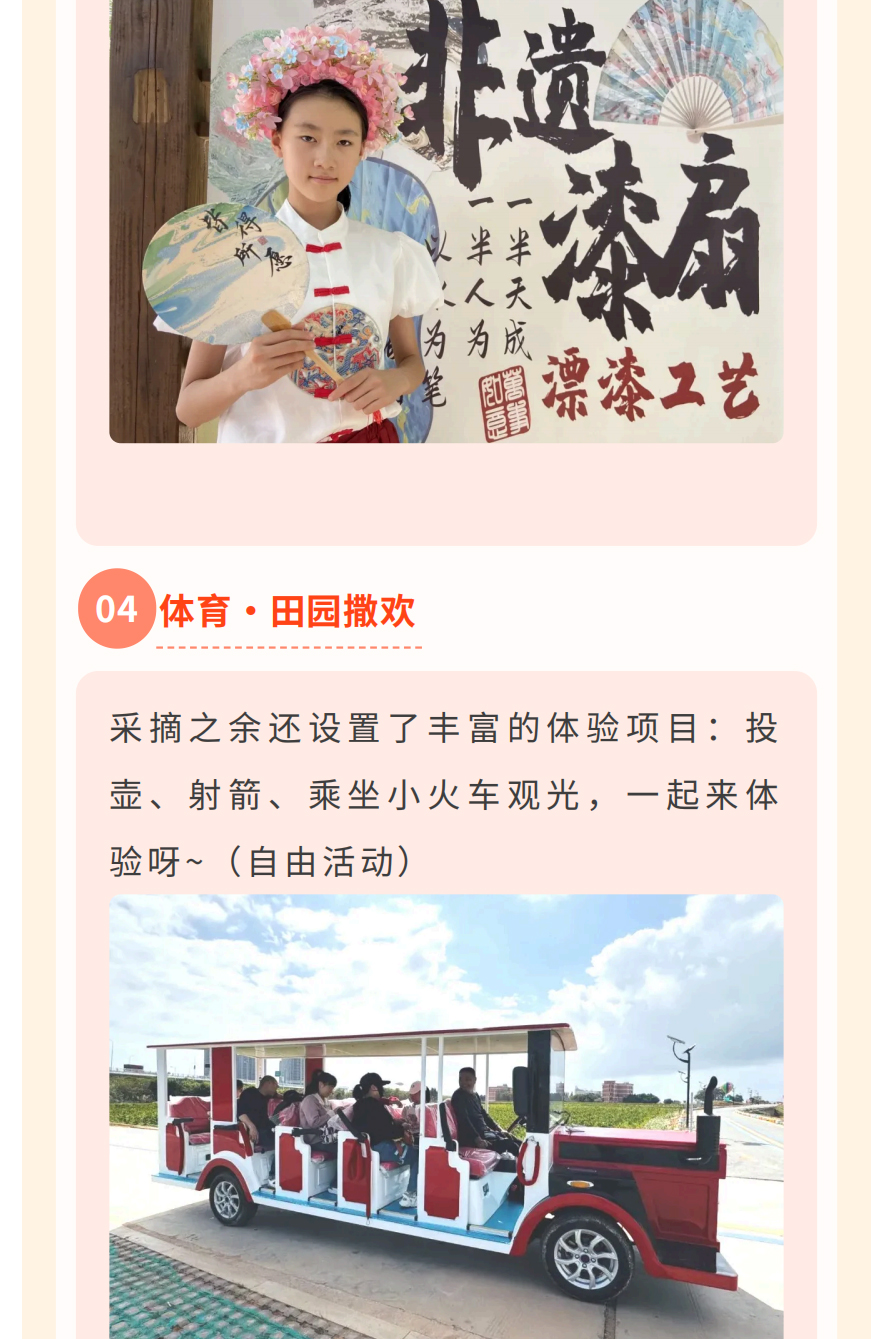 摘草莓鲜果+制作草莓甘露+体验非遗漆扇+坐观光小火车......