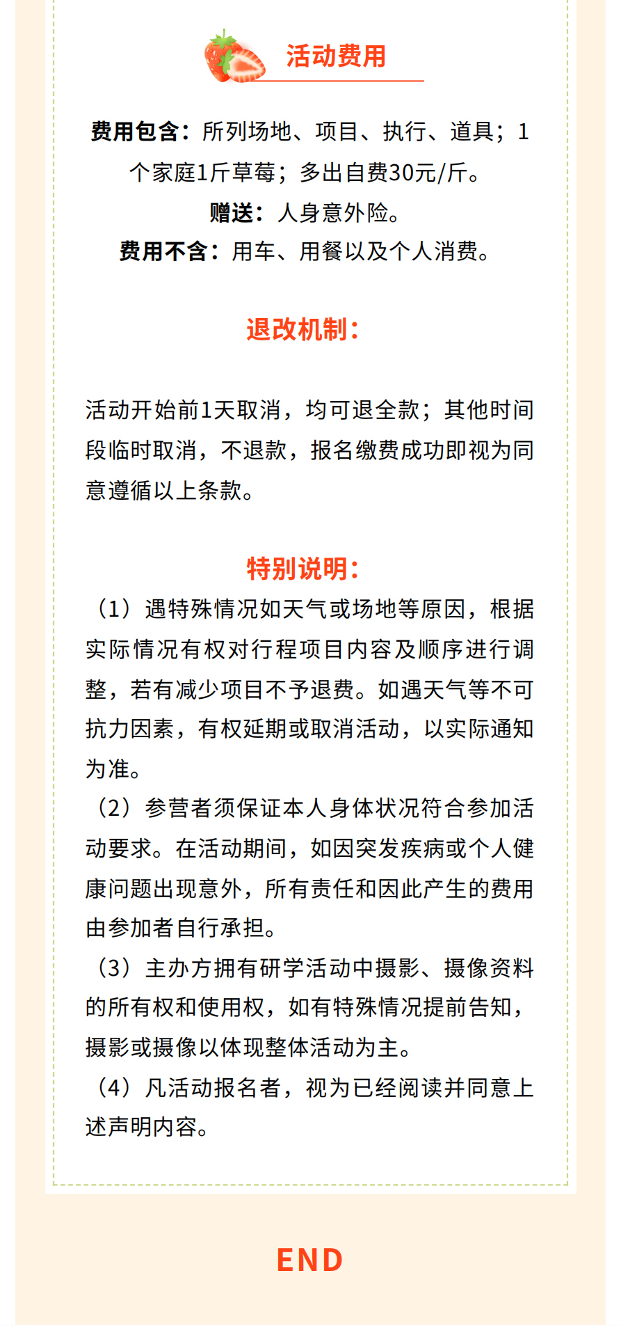 1.遇特殊情况如天气或场地等原因,根据实际情况有权对行程项目内容进行调整,若有减少项目不予退费。如遇天气等不可抗力因素,有权延期或取消活动,以实际通知为准。