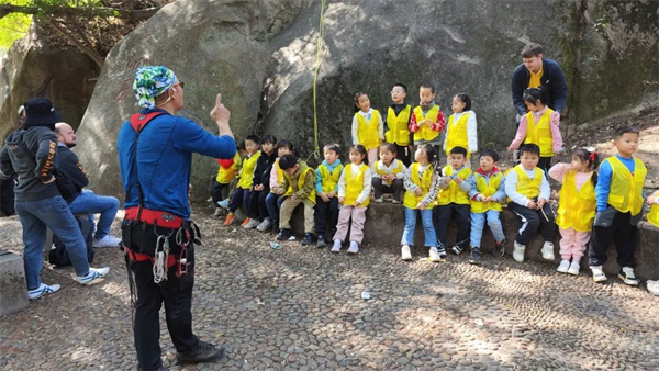 攀岩实战环节中,岩壁贴有“水妖”“石怪”标识,每登高一步象征击败一个敌人,孩子们在挑战中学会冷静应对困难。