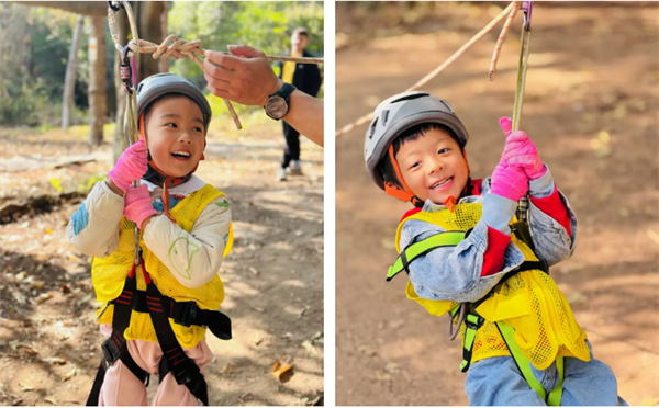 树间溜索环节中,孩子们化身“风火轮哪吒”,滑行穿越树林,克服高空恐惧。10岁的乐乐最初害怕闭眼,但在教练的鼓励下,安全落地后,甚至积极主动地申请再试一次。