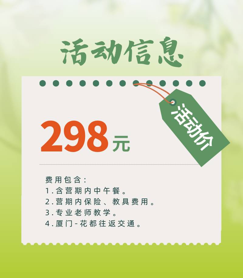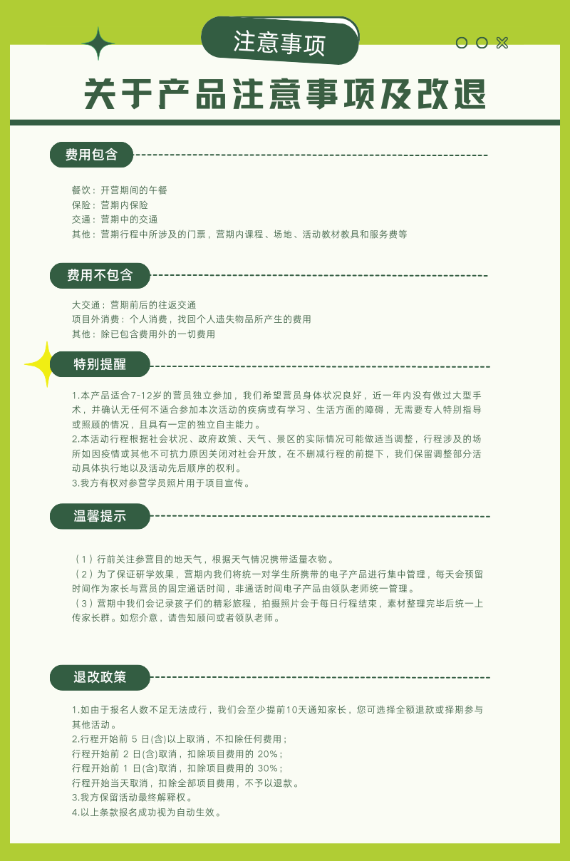 其他:营期行程中所涉及的门票,营期内课程、场地、活动教材教具和服务费等