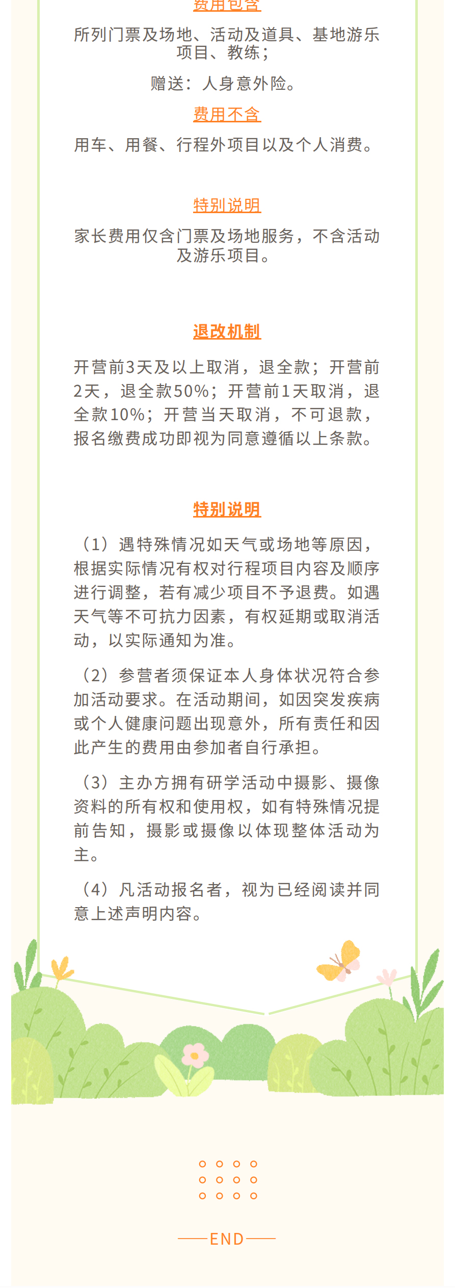 1.遇特殊情况如天气或场地等原因,根据实际情况有权对行程项目内容进行调整,若有减少项目不予退费。如遇天气等不可抗力因素,有权延期或取消活动,以实际通知为准。