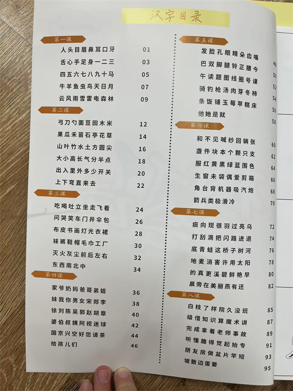 基础笔画训练:横、竖、撇、捺等基本笔画的规范写法及力度控制;学习笔顺规则、偏旁部首搭配及字形结构(如左右结构、上下结构);从数字、拼音到简单汉字(如“人、口、日”),逐步过渡到短句书写;书写姿势矫正:强调“一拳一尺一寸”坐姿,纠正握笔姿势。