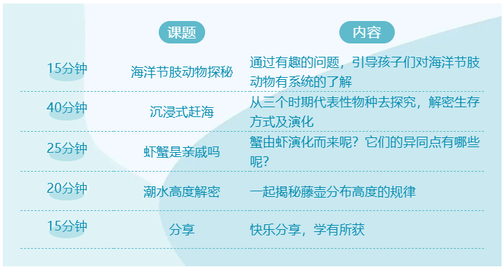 沉浸式赶海让孩子们感受到的是大自然的美丽和神奇。我们以海洋节肢动物代表性的藤壶、鲎、招潮蟹、寄居蟹、鼓虾等生物为研究对象,深度的了解它们生存技能揭秘!在这个过程中,孩子们会海洋物种的进化会有更多了解。