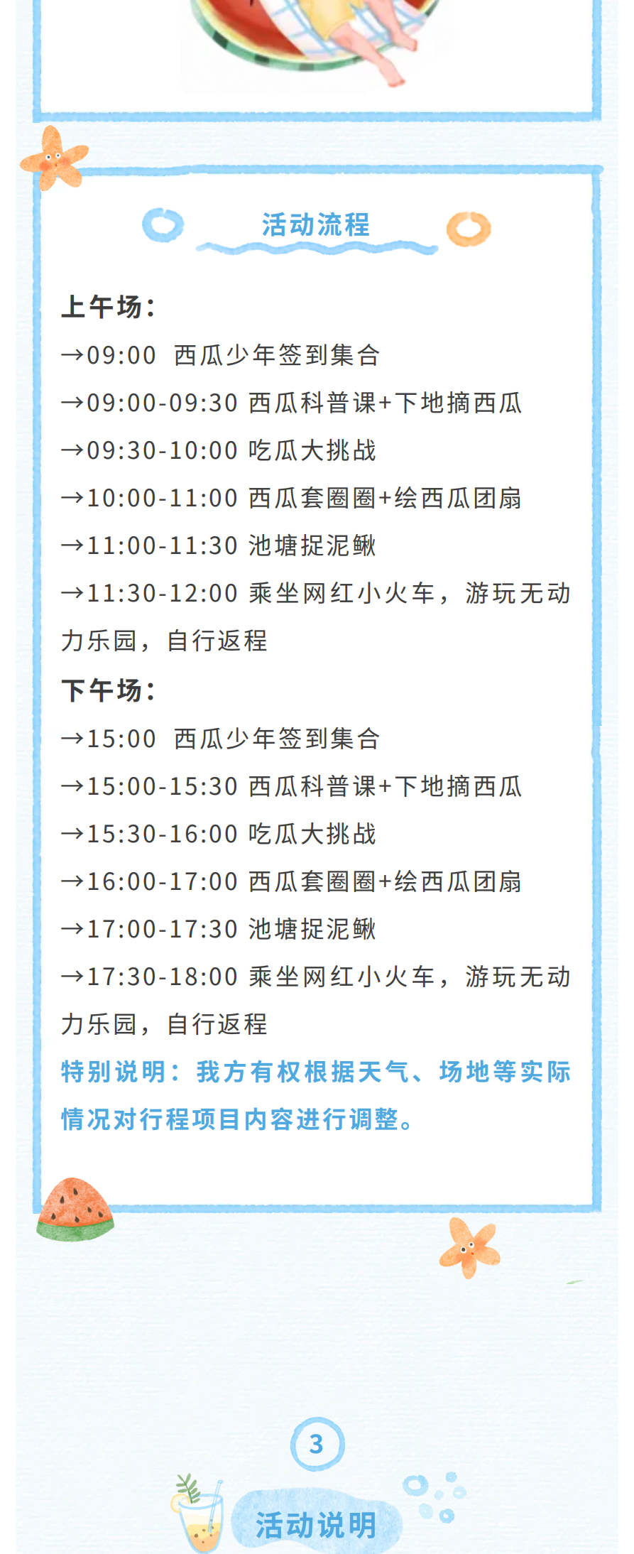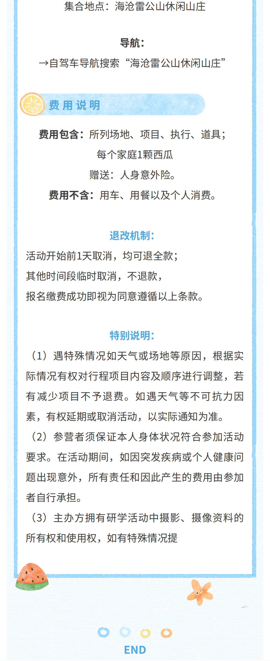 1.遇特殊情况如天气或场地等原因,根据实际情况有权对行程项目内容进行调整,若有减少项目不予退费。如遇天气等不可抗力因素,有权延期或取消活动,以实际通知为准。