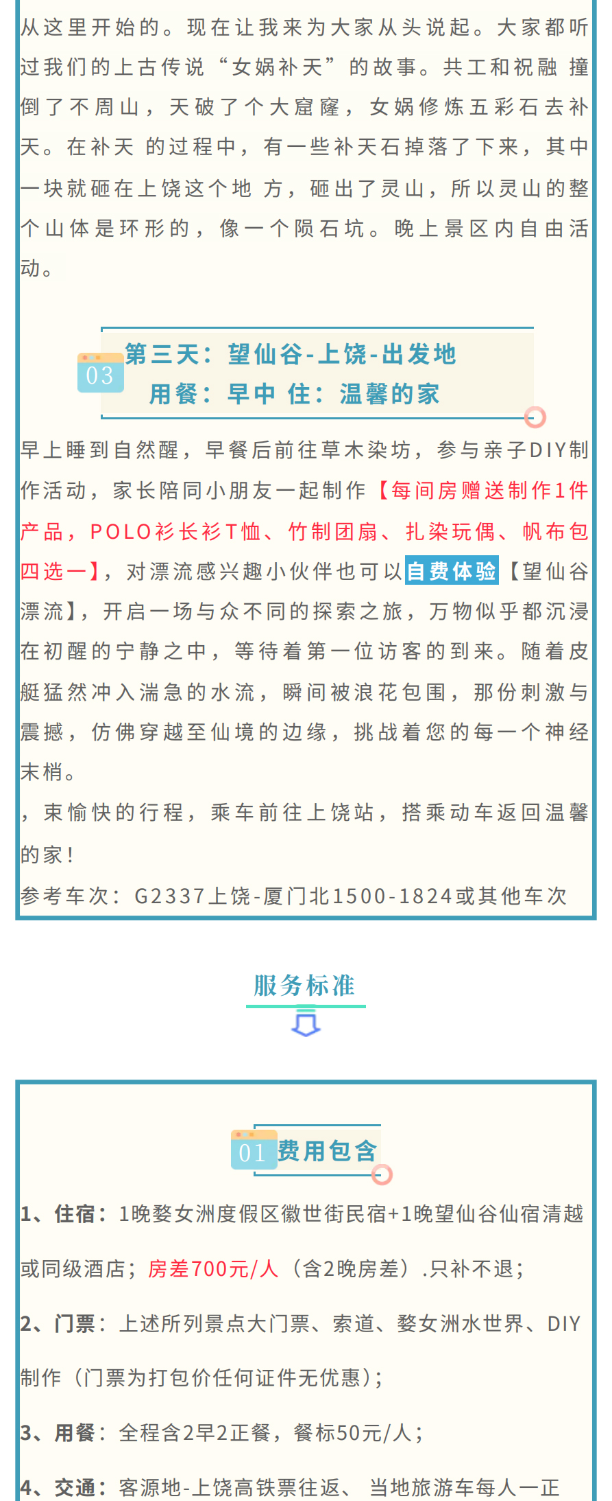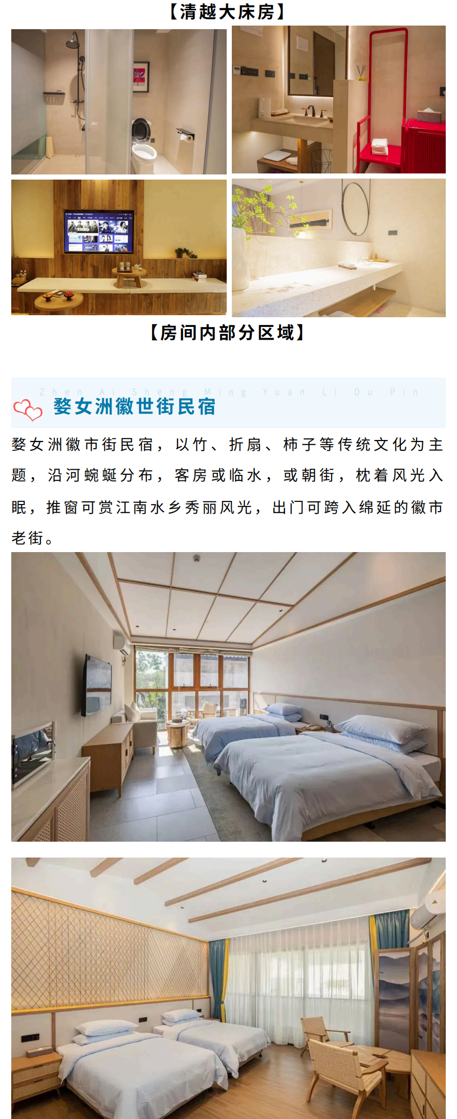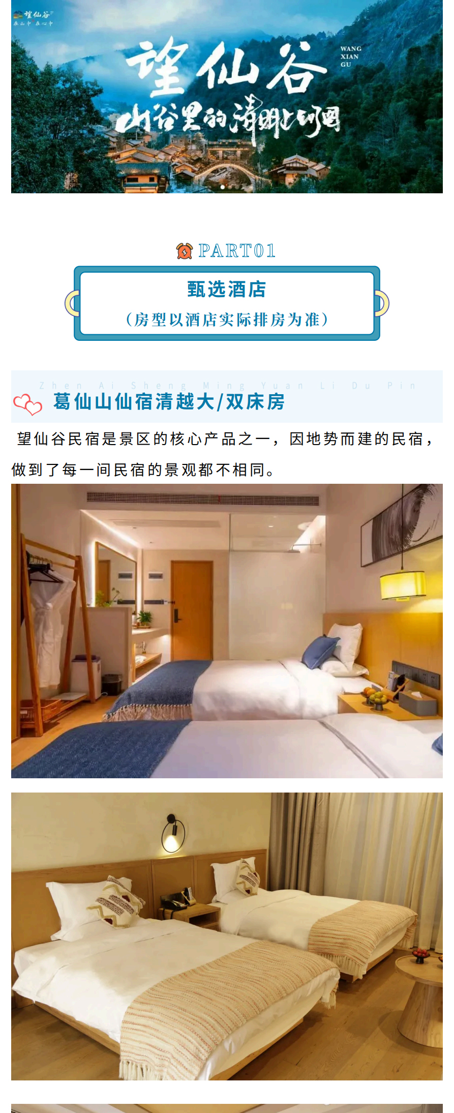 1、住宿:1晚婺女洲度假区徽世街民宿+1晚望仙谷仙宿清越或同级酒店;房差700元/人(含2晚房差).只补不退;