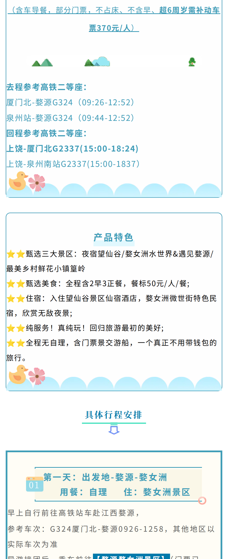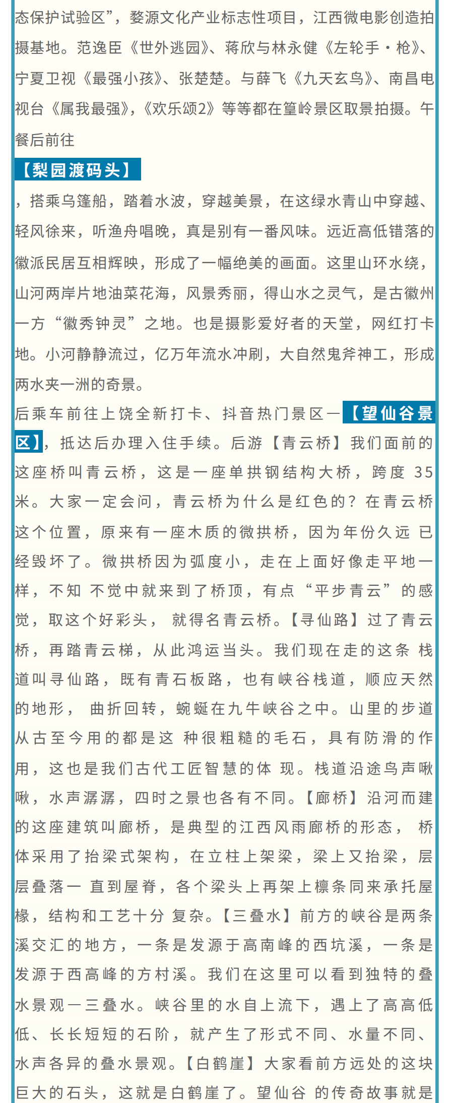 4、交通:客源地-上饶高铁票往返、 当地旅游车每人一正座;