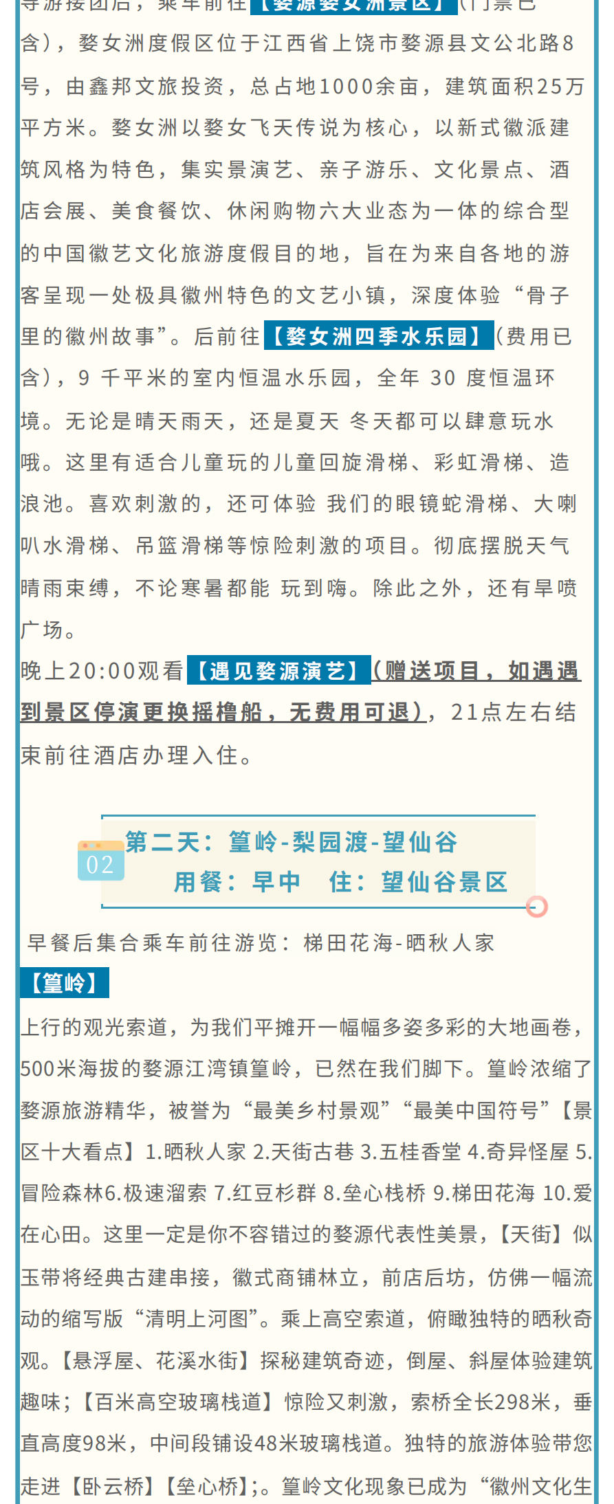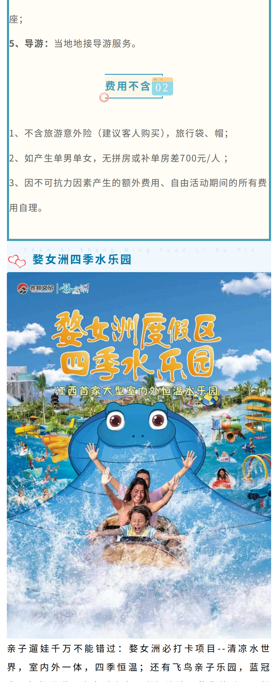 2、门票:上述所列景点大门票、索道、婺女洲水世界、DIY制作(门票为打包价任何证件无优惠);