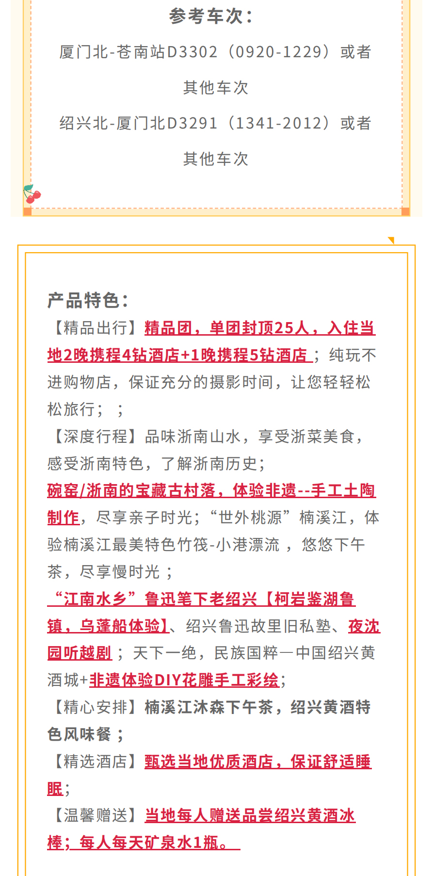 3、交通:出发地至苍南站, 绍兴北至出发地 往返二等座动车票;当地旅游空调车,保证一人一个正座;