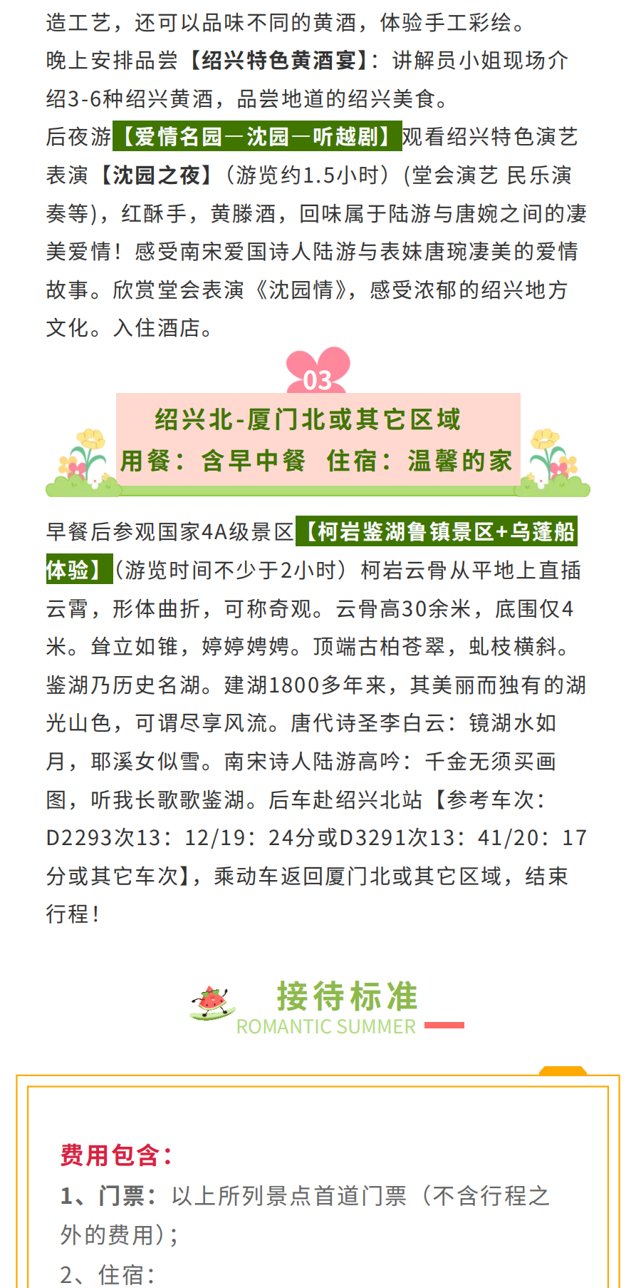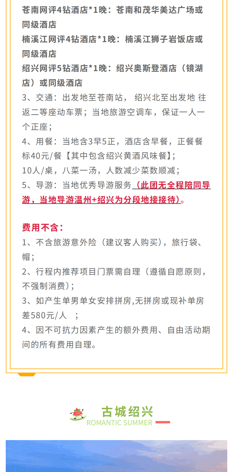 4、用餐:当地含3早5正,酒店含早餐,正餐餐标40元/餐【其中包含绍兴黄酒风味餐】;