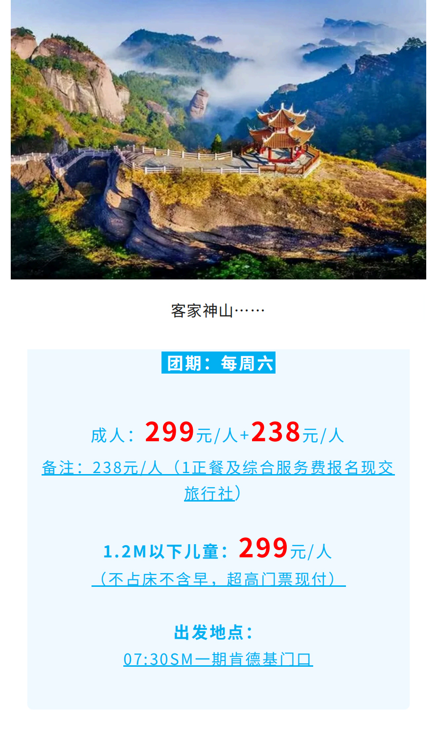 成人/人:299元/人+238元/人(1正餐及综合服务费报名现交旅行社)