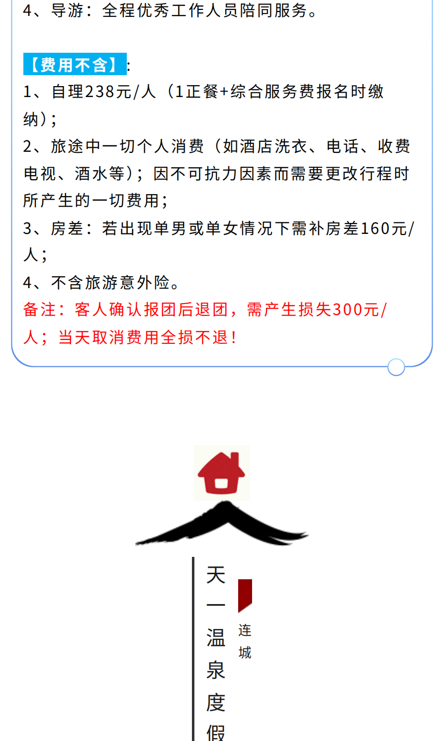 确认报团后退团,需产生损失300元/人;当天取消费用全损不退!