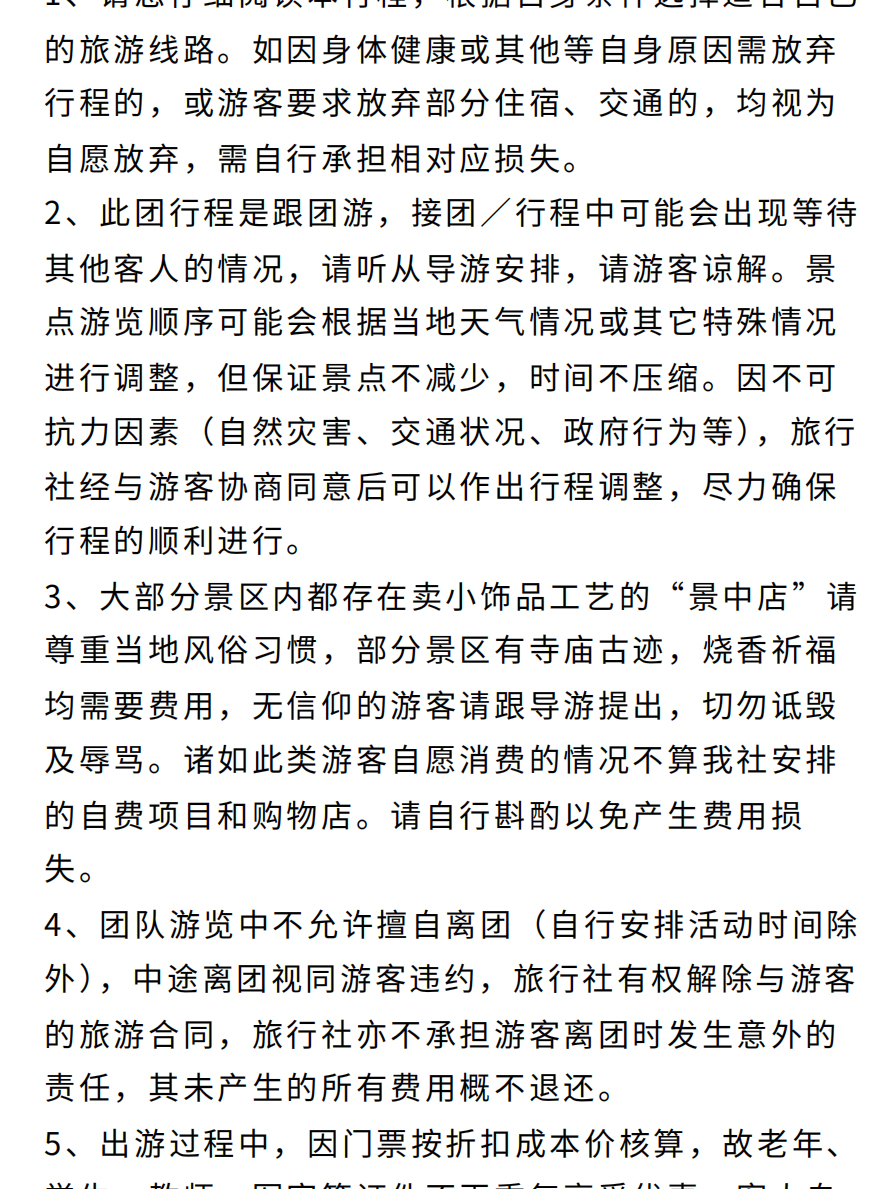 2、旅途中一切个人消费(如酒店洗衣、电话、收费电视、酒水等);因不可抗力因素而需要更改行程时所产生的一切费用;