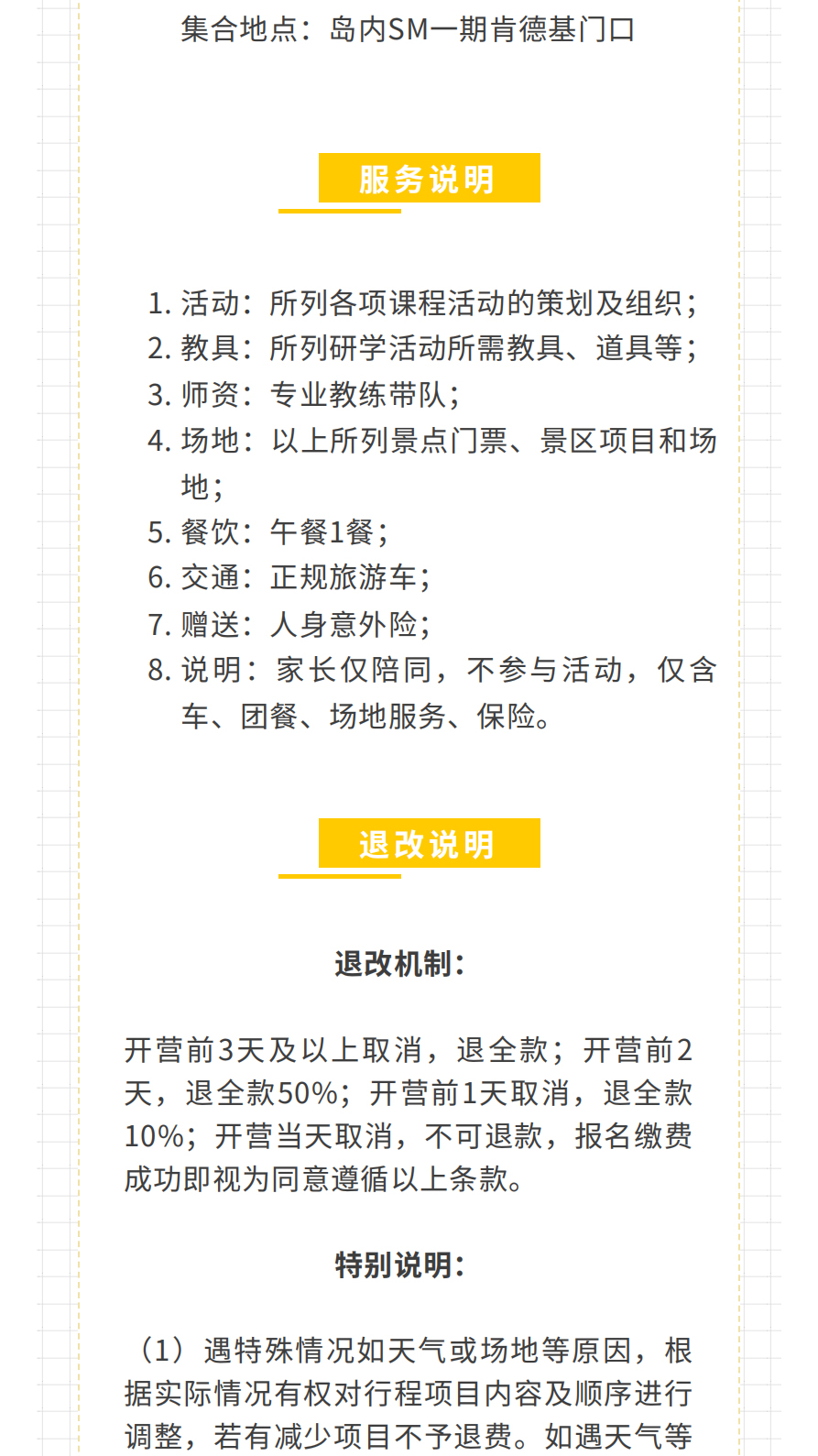 1.遇特殊情况如天气或场地等原因,根据实际情况有权对行程项目内容进行调整,若有减少项目不予退费。如遇天气等不可抗力因素,有权延期或取消活动,以实际通知为准。
