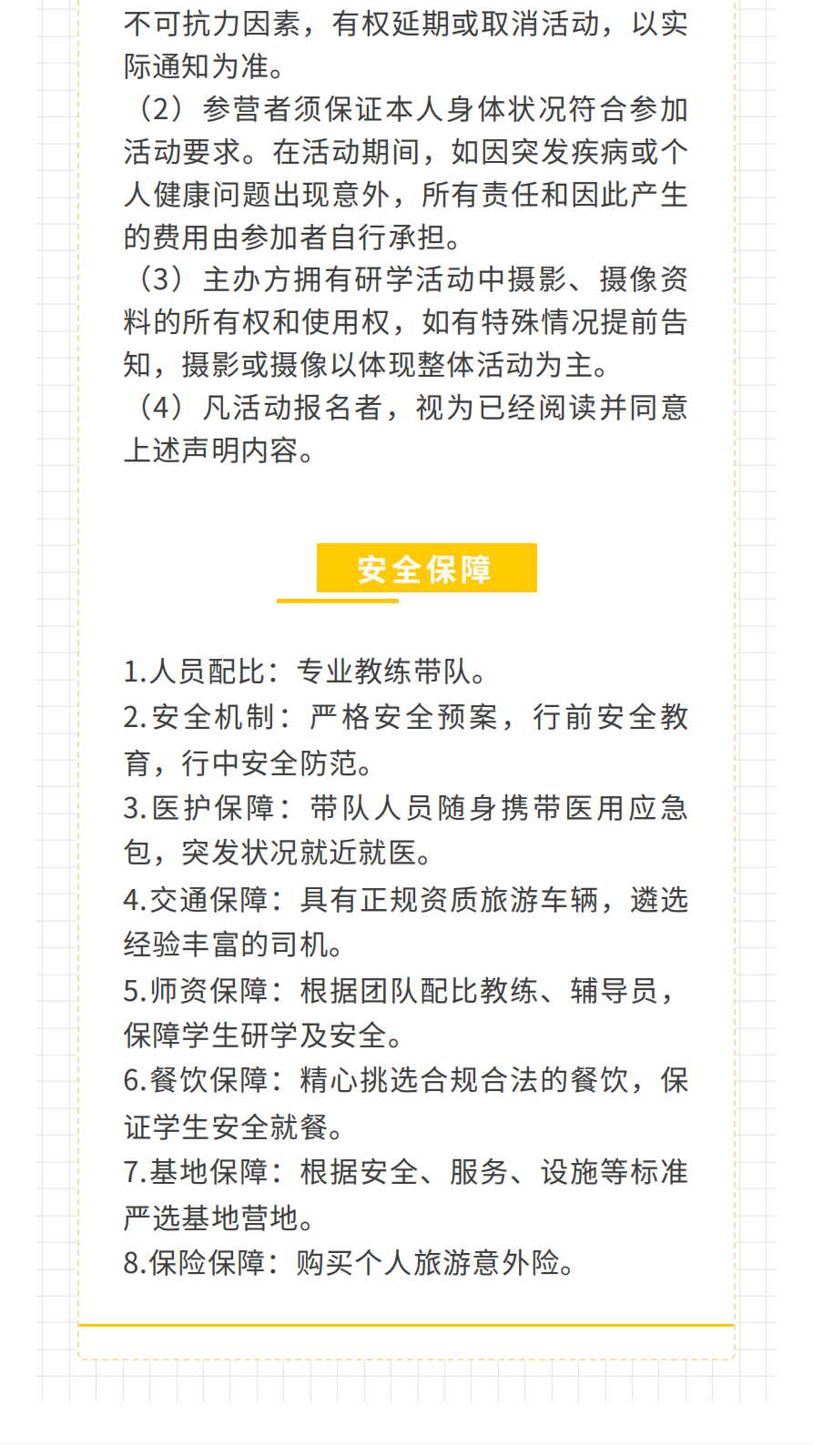 3.主办方拥有研学活动中摄影、摄像资料的所有权和使用权,如有特殊情况提前告知,摄影或摄像以体现整体活动为主。
