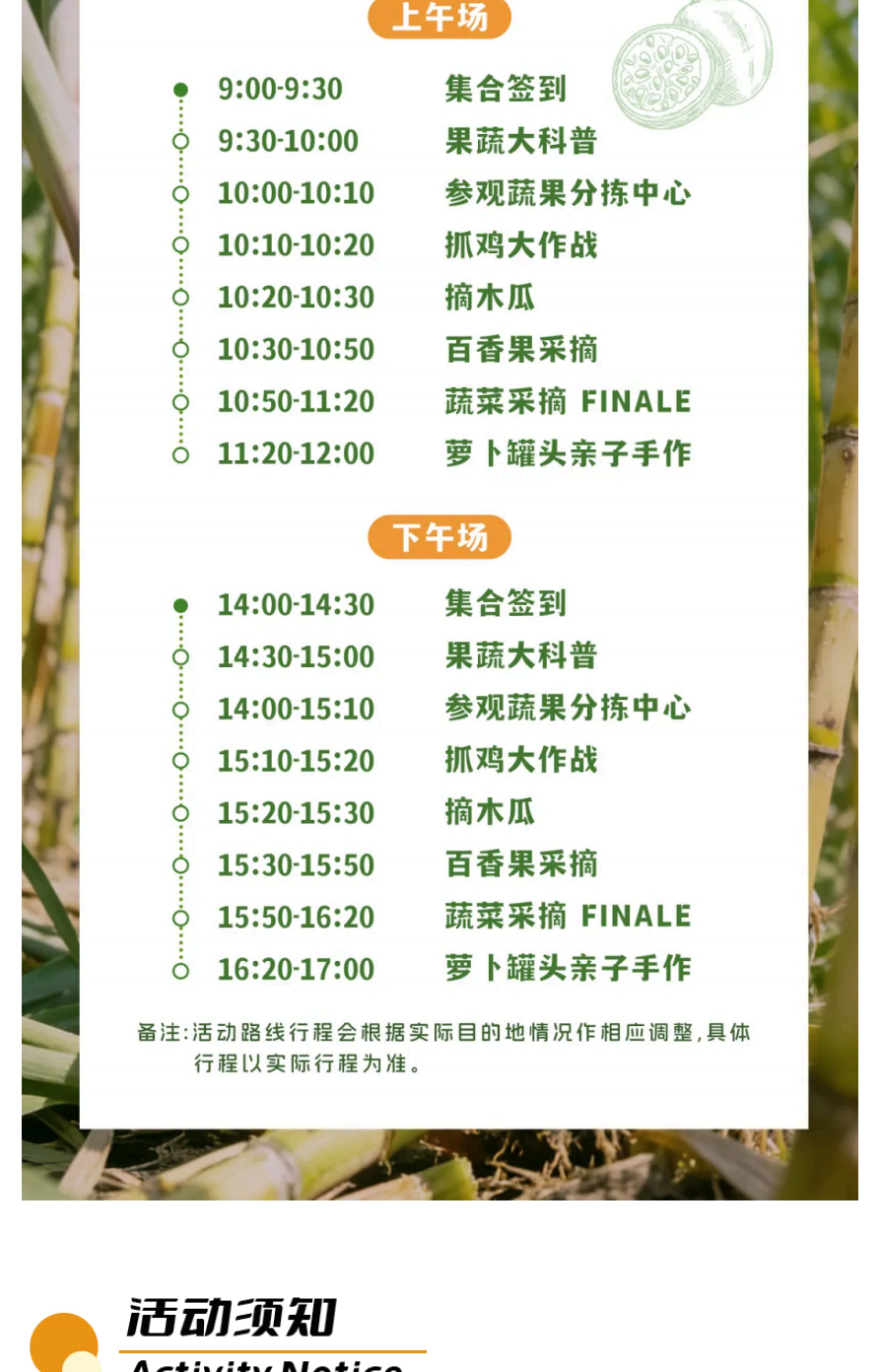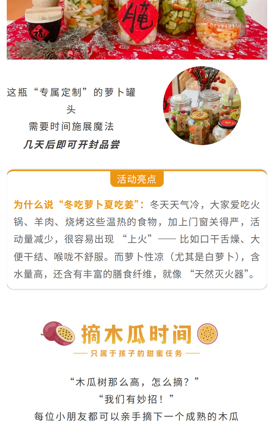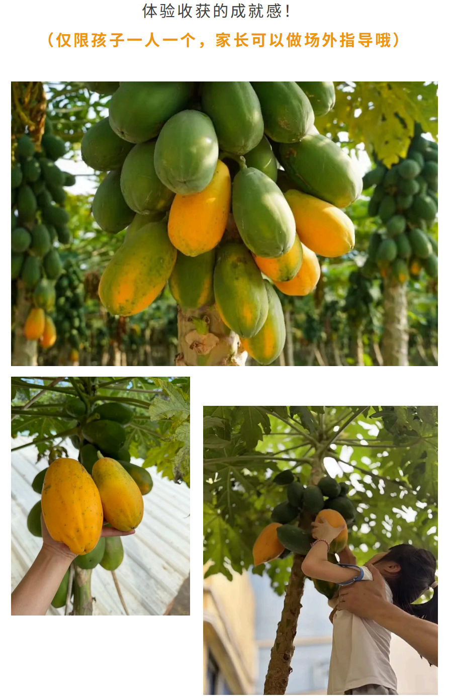 所有采摘体验(木瓜1个/孩、百香果4颗/人、蔬菜若干、萝卜1根/人、萝卜罐头1个/孩)多出的自行与农场主购买。