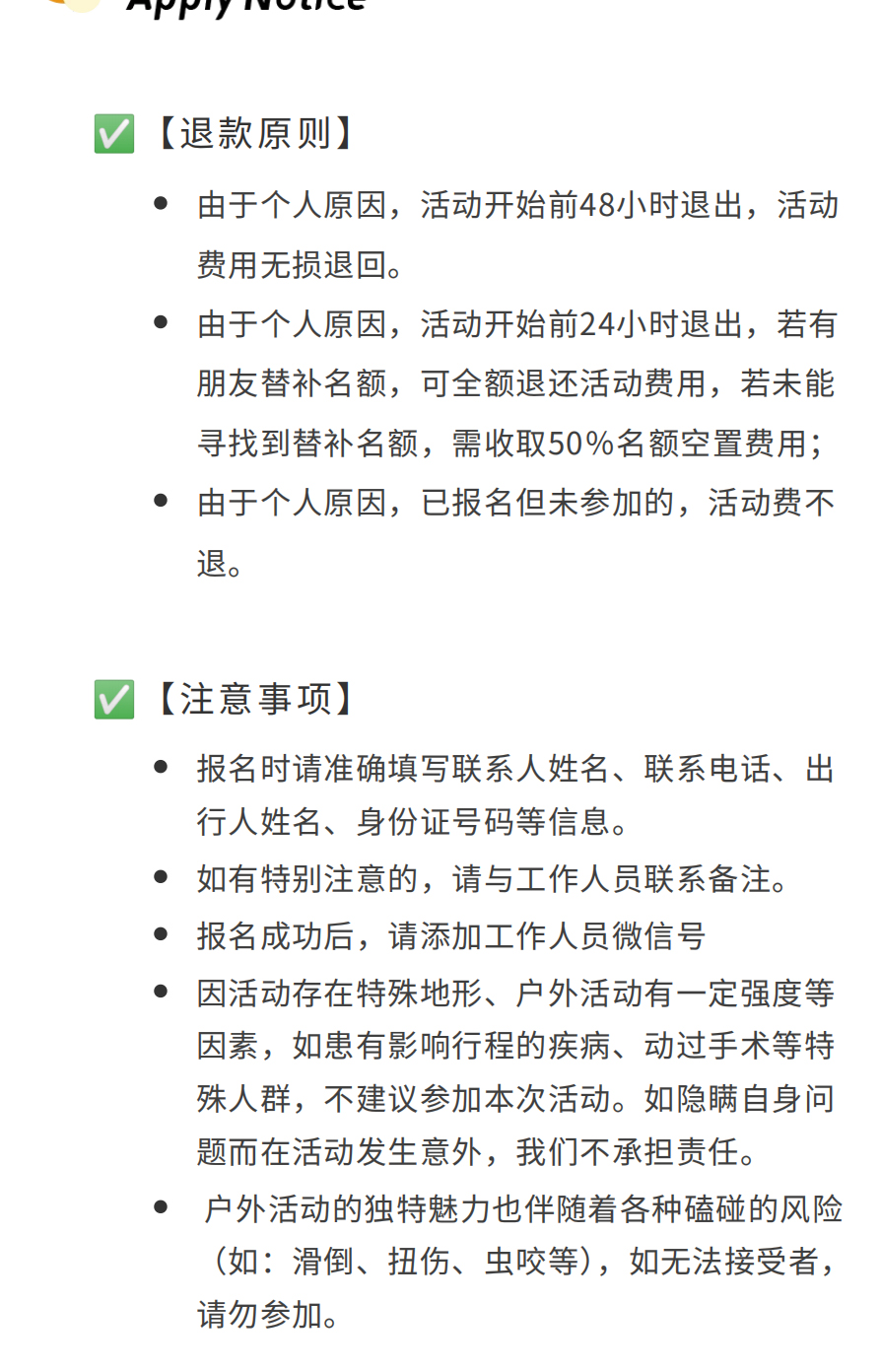由于个人原因,活动开始前24小时退出,若有朋友替补名额,可全额退还活动费用,若未能寻找到替补名额,需收取50%名额空置费用;