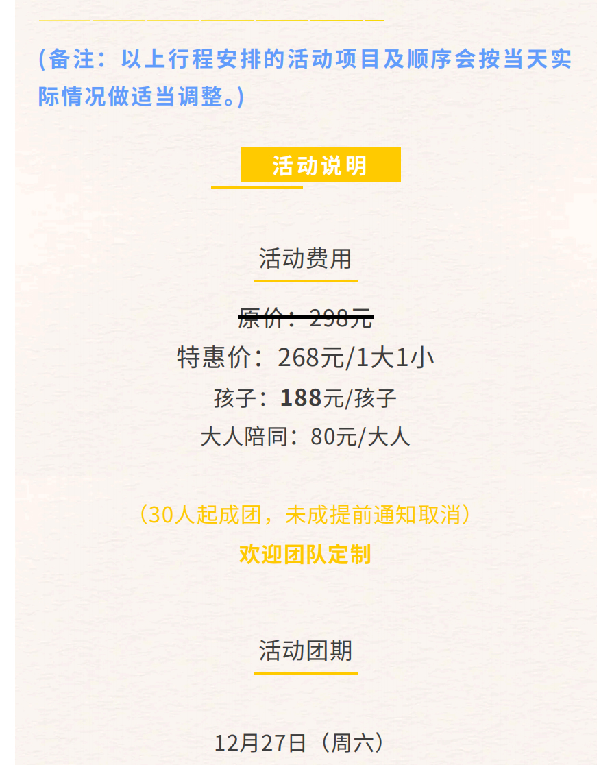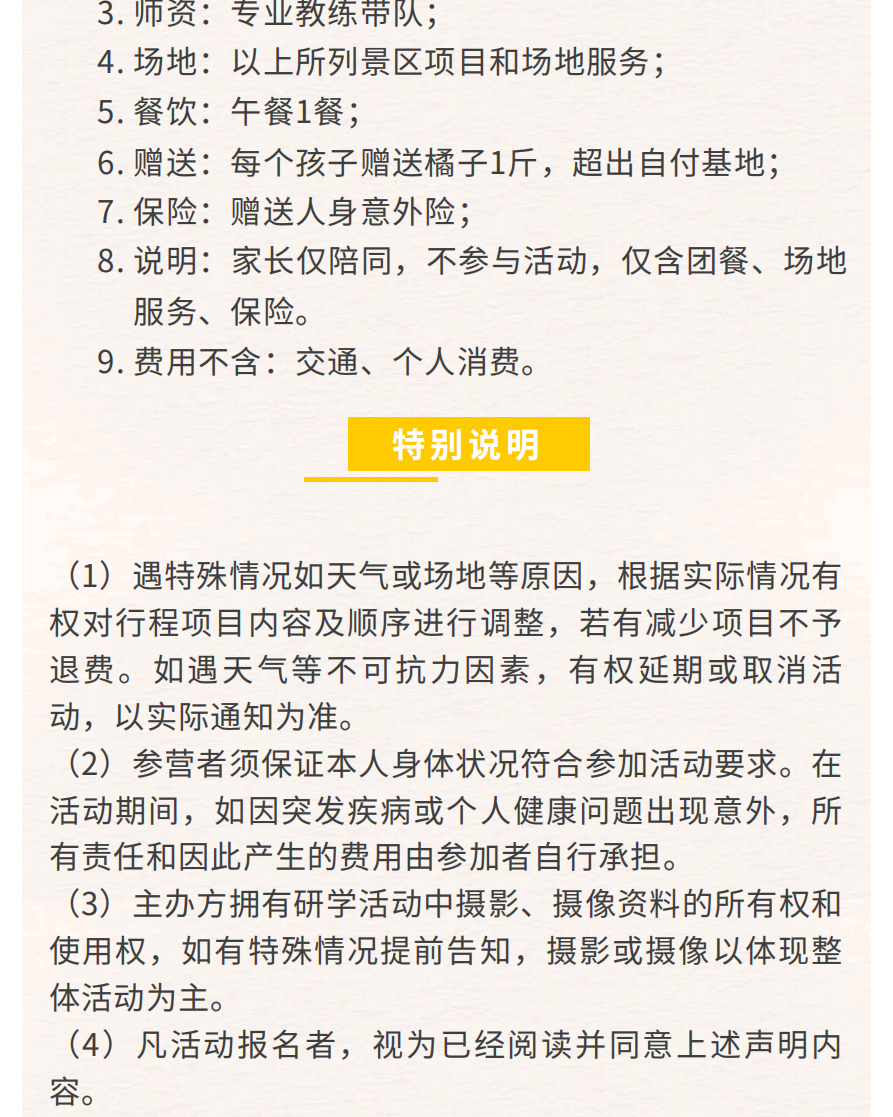 1.遇特殊情况如天气或场地等原因,根据实际情况有权对行程项目内容进行调整,若有减少项目不予退费。如遇天气等不可抗力因素,有权延期或取消活动,以实际通知为准。