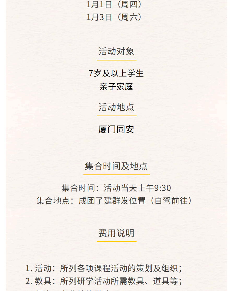 说明:家长仅陪同,不参与活动,仅含团餐、场地服务、保险。