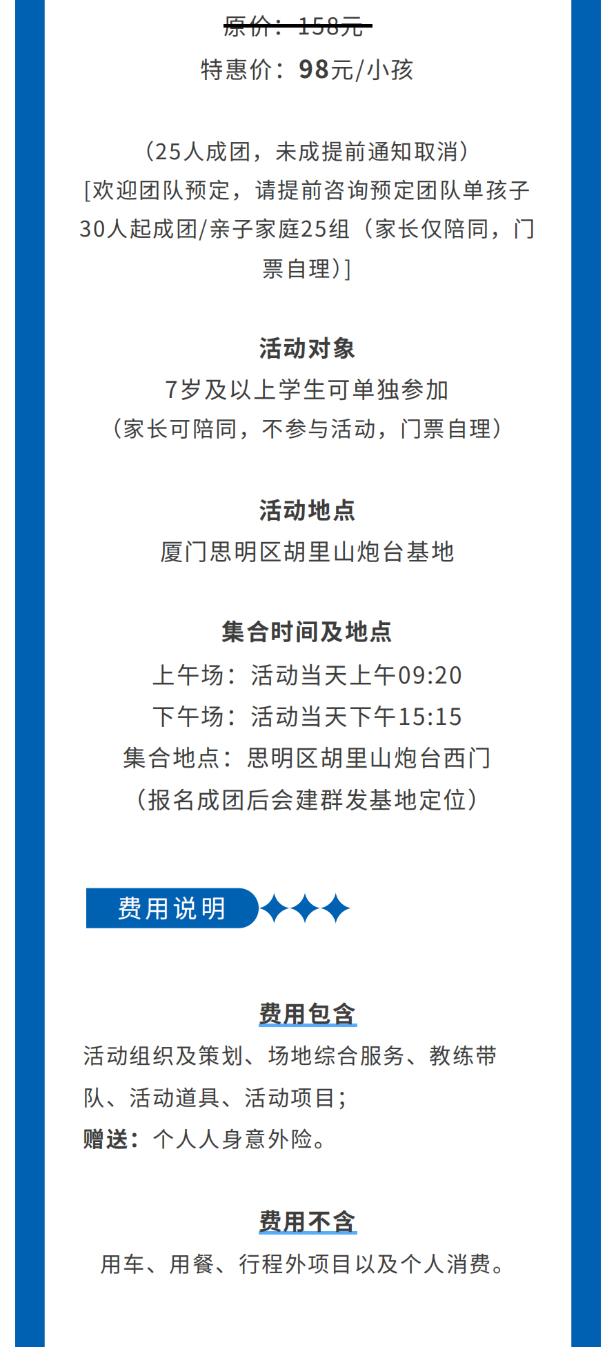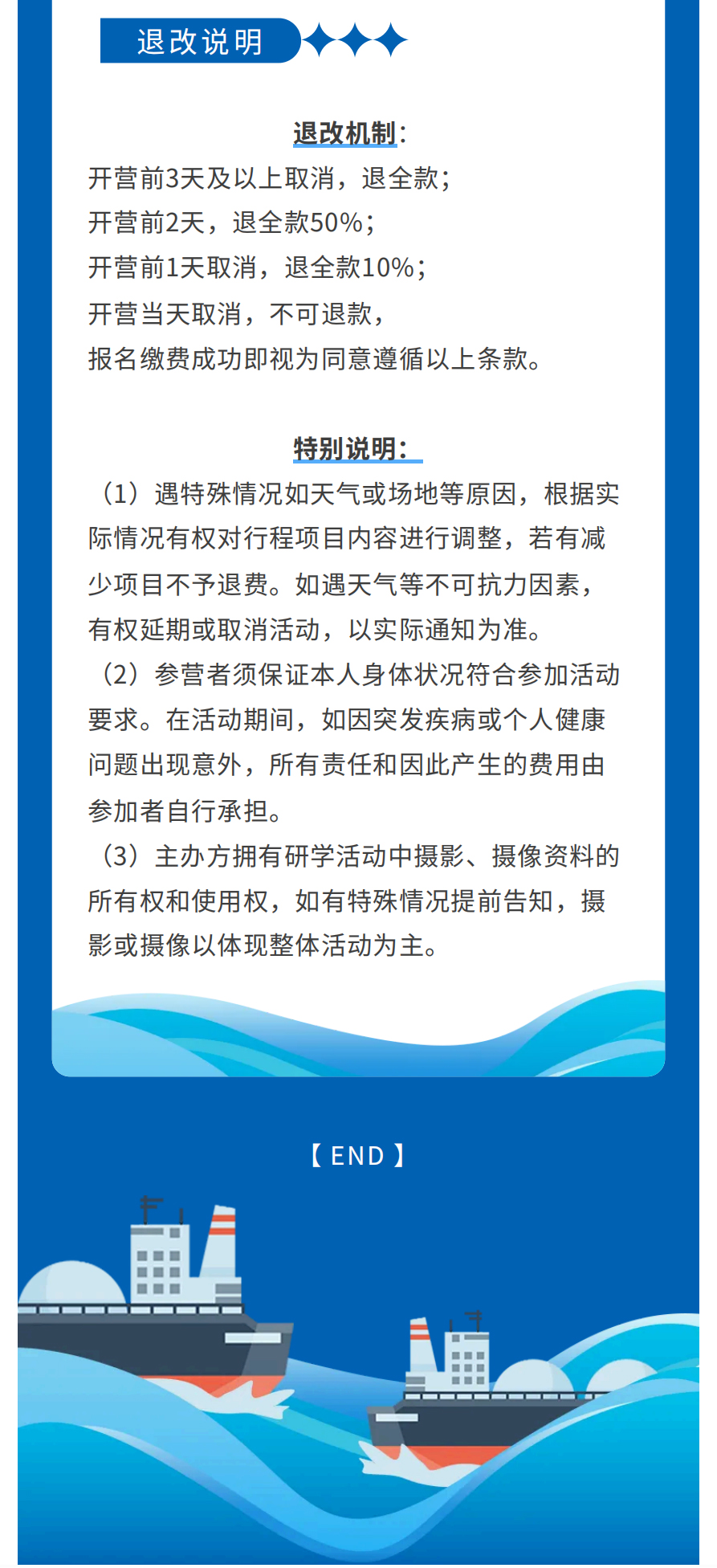 1.遇特殊情况如天气或场地等原因,根据实际情况有权对行程项目内容进行调整,若有减少项目不予退费。如遇天气等不可抗力因素,有权延期或取消活动,以实际通知为准。