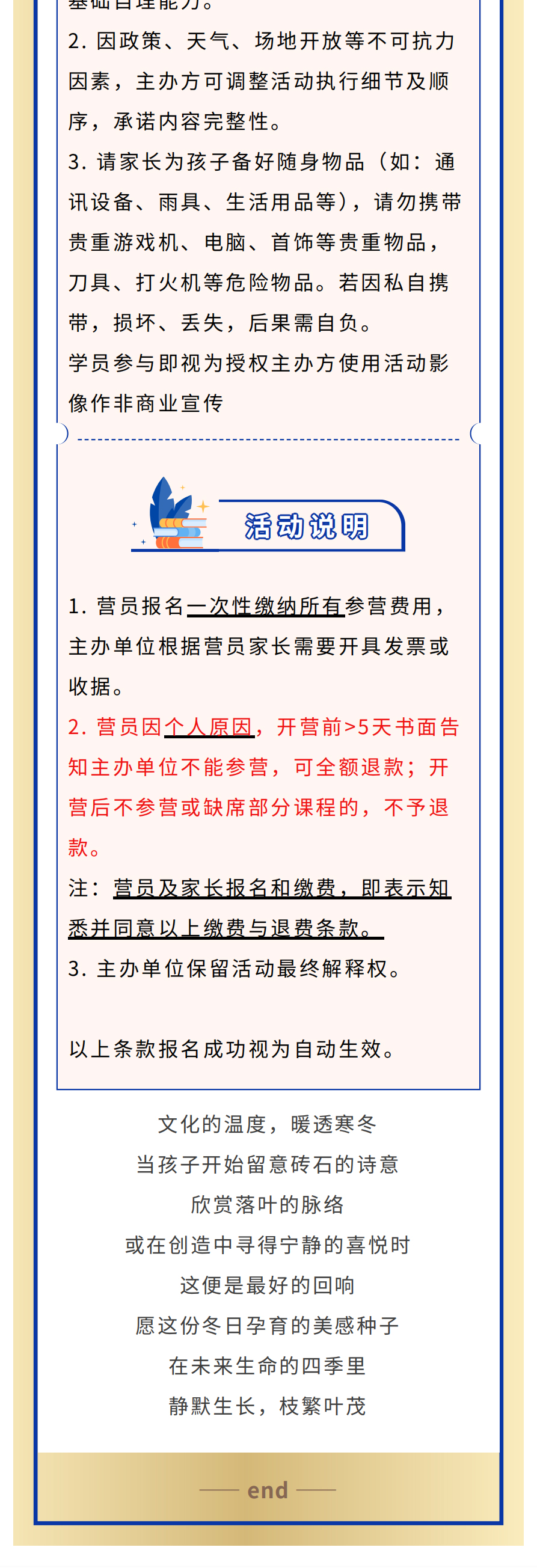 3.主办方拥有研学活动中摄影、摄像资料的所有权和使用权,如有特殊情况提前告知,摄影或摄像以体现整体活动为主。