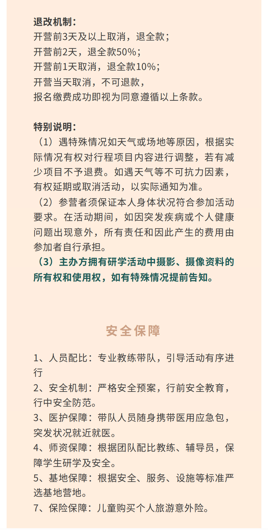 1.遇特殊情况如天气或场地等原因,根据实际情况有权对行程项目内容进行调整,若有减少项目不予退费。如遇天气等不可抗力因素,有权延期或取消活动,以实际通知为准。
