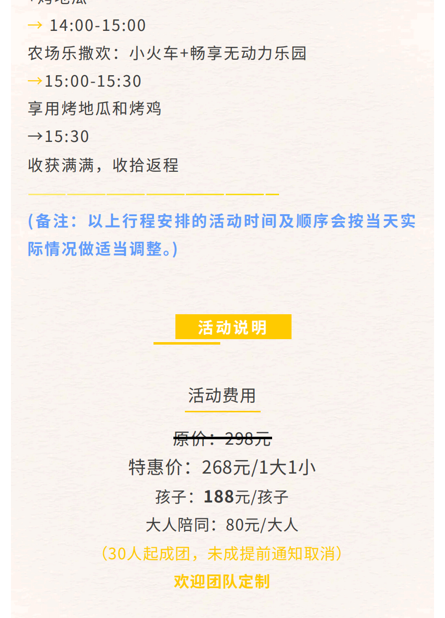 1.遇特殊情况如天气或场地等原因,根据实际情况有权对行程项目内容进行调整,若有减少项目不予退费。如遇天气等不可抗力因素,有权延期或取消活动,以实际通知为准。