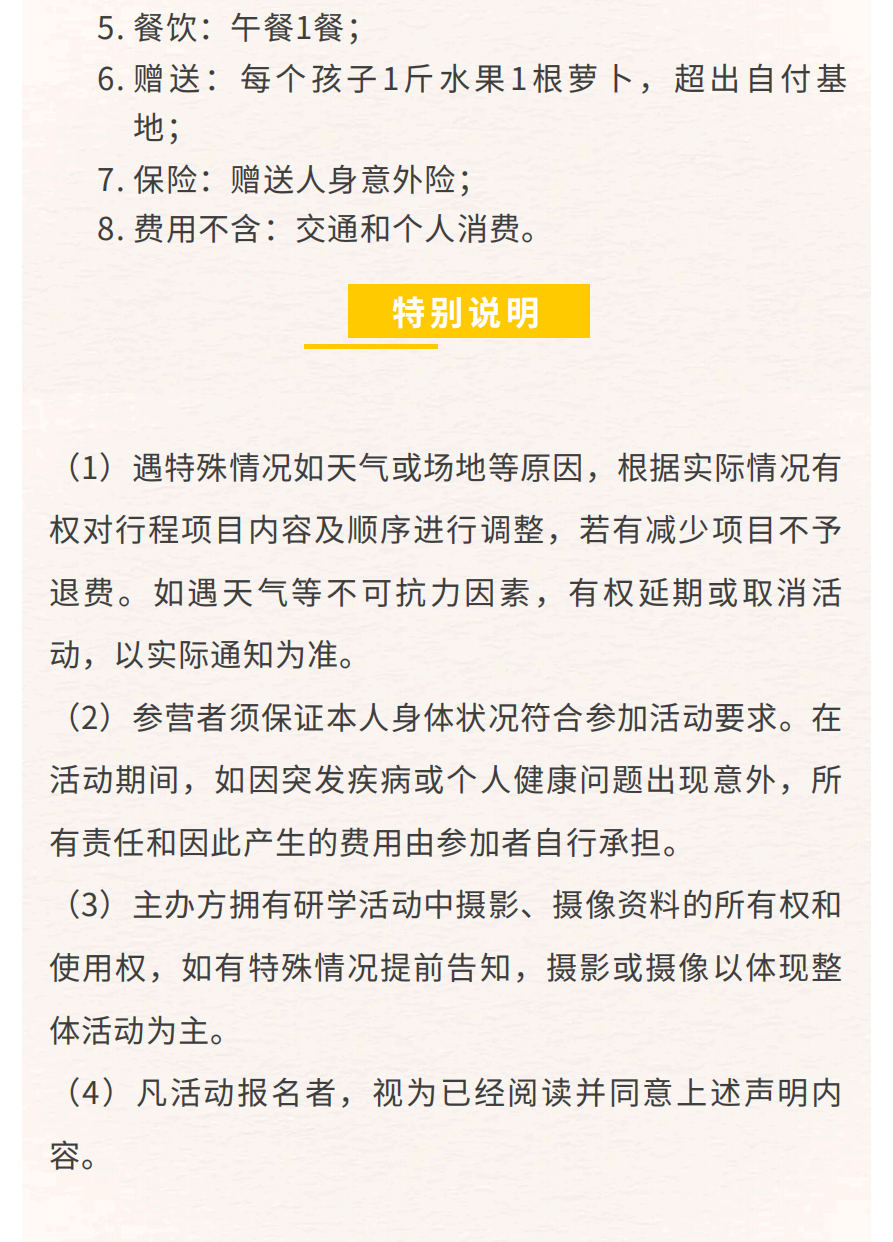 7.说明:家长仅陪同,不参与活动,仅含餐、场地服务、保险。