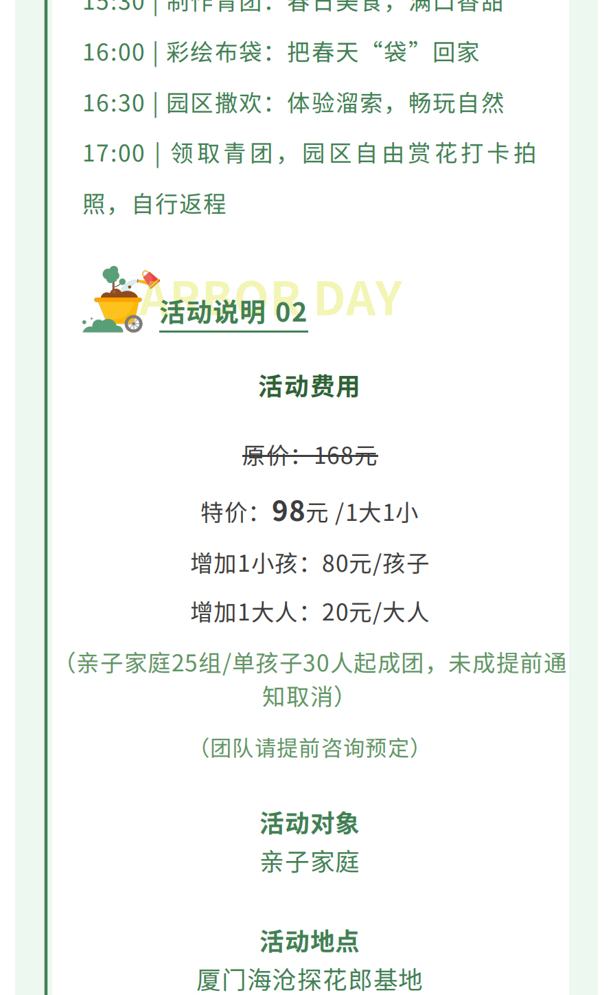98元 /一大一小,80元/增加儿童,20元/增加家长