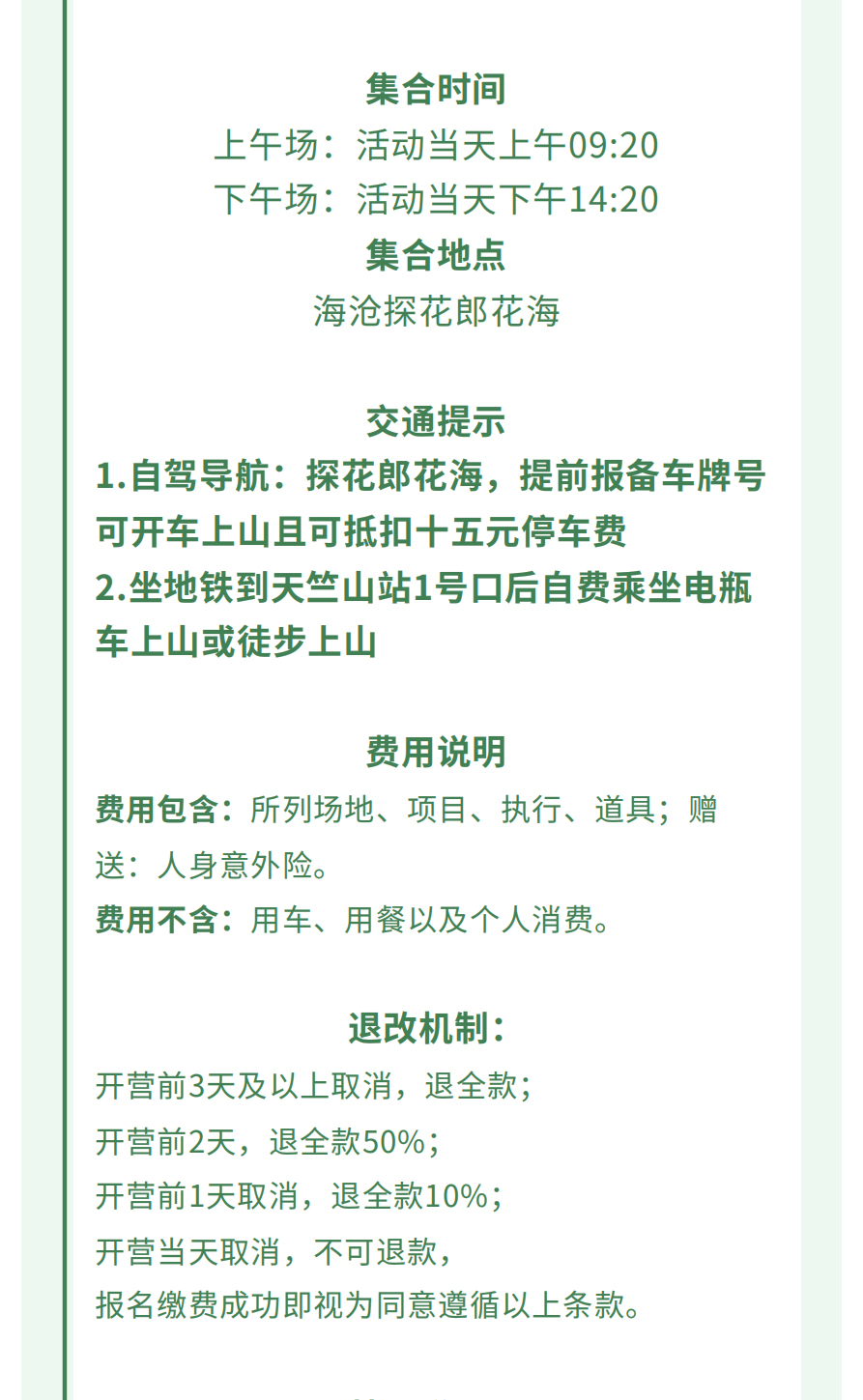 1.遇特殊情况如天气或场地等原因,根据实际情况有权对行程项目内容进行调整,若有减少项目不予退费。如遇天气等不可抗力因素,有权延期或取消活动,以实际通知为准。