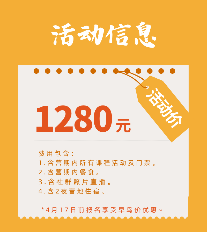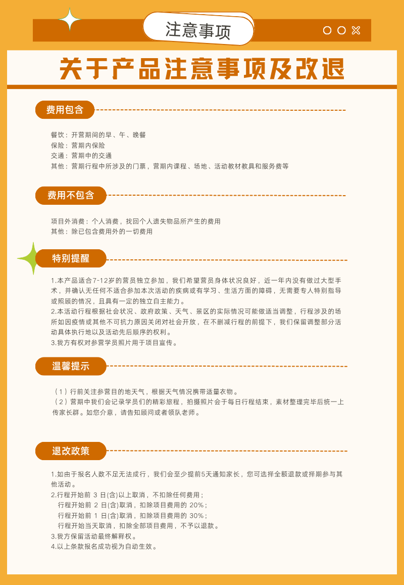 其他:营期行程中所涉及的门票,营期内课程、场地、活动教材教具和服务费等