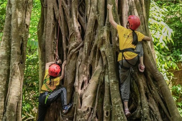 穿戴好装备,在安全员、安全绳索的保护下,攀爬高达20米的榕树,你准备好了吗?一起战胜自我内心的恐惧,去丈量榕树的高大。