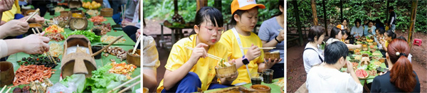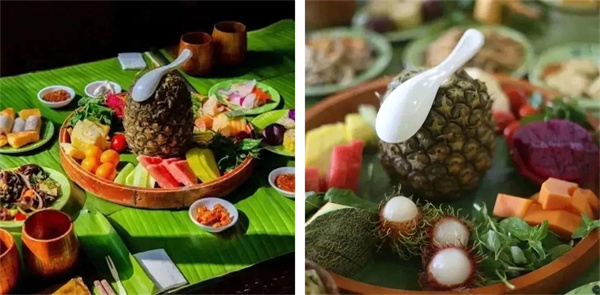 越过沟壑,进入雨林中,一桌子雨林餐等着享用,雨林大餐不仅环境很野,食材很野,烹饪的方式也很野,竹筒饭、包烧红尾巴鱼、包烧肉看得人垂涎三尺。