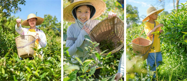【采大树茶】在当地专人的带领下,孩子们背上背篓、戴上草帽、涂上防蚊液,学习采摘大树茶叶,体验采茶乐趣,识别大树茶、感受茶农采茶艰辛。