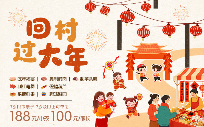 回村过大年:吃年猪宴+裹制封肉+制芋头糕+制红龟粿+做糖葫芦+采摘鲜果+趣味游园