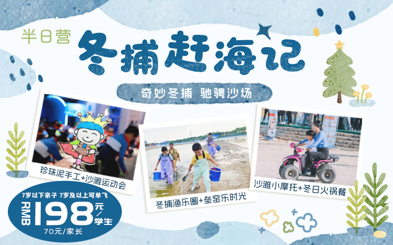 冬捕赶海记:冬捕渔乐圈+垒窑乐时光+珍珠泥手工+沙滩运动会+沙滩小摩托+冬日火锅餐......